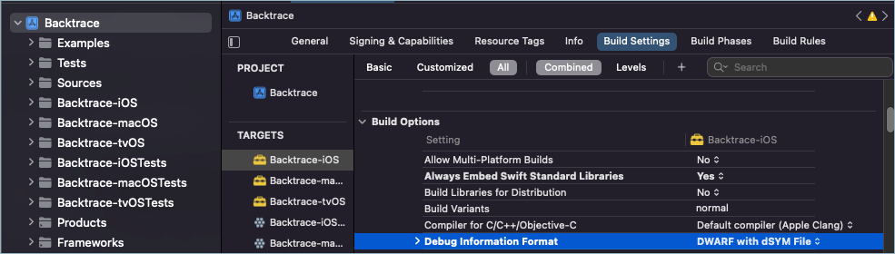- Under Build Options, set Debug Information Format to DWARF with dSYM File.
