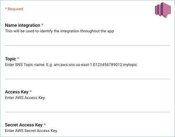 - Access key (make sure this user has permission to publish to the provided SNS topic)