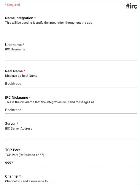 This guide goes through the steps necessary to integrate Backtrace with IRC. With IRC integration, Backtrace can send an alert message for new crashes or crash groups to a specified channel on an IRC server. This message will contain a URL to view more detailed information about the crash in the Web Console.