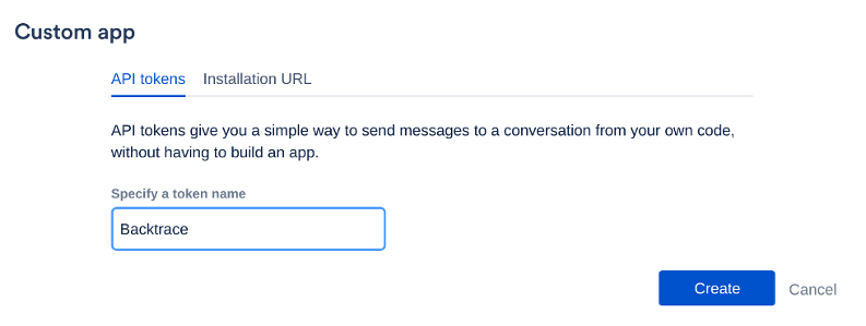 • Ensure that 'API tokens' is selected not 'Installation URL', and give the application a name. This name will show up whenever Backtrace posts messages through this API. After giving the App a name click the create button.