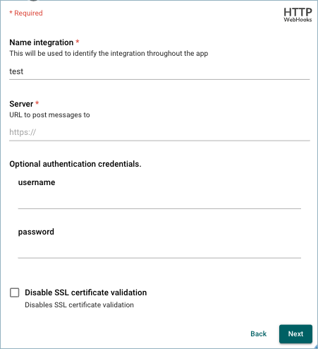 Select webhook and fill in the required settings (name and the webhook URL you generated in the step above).